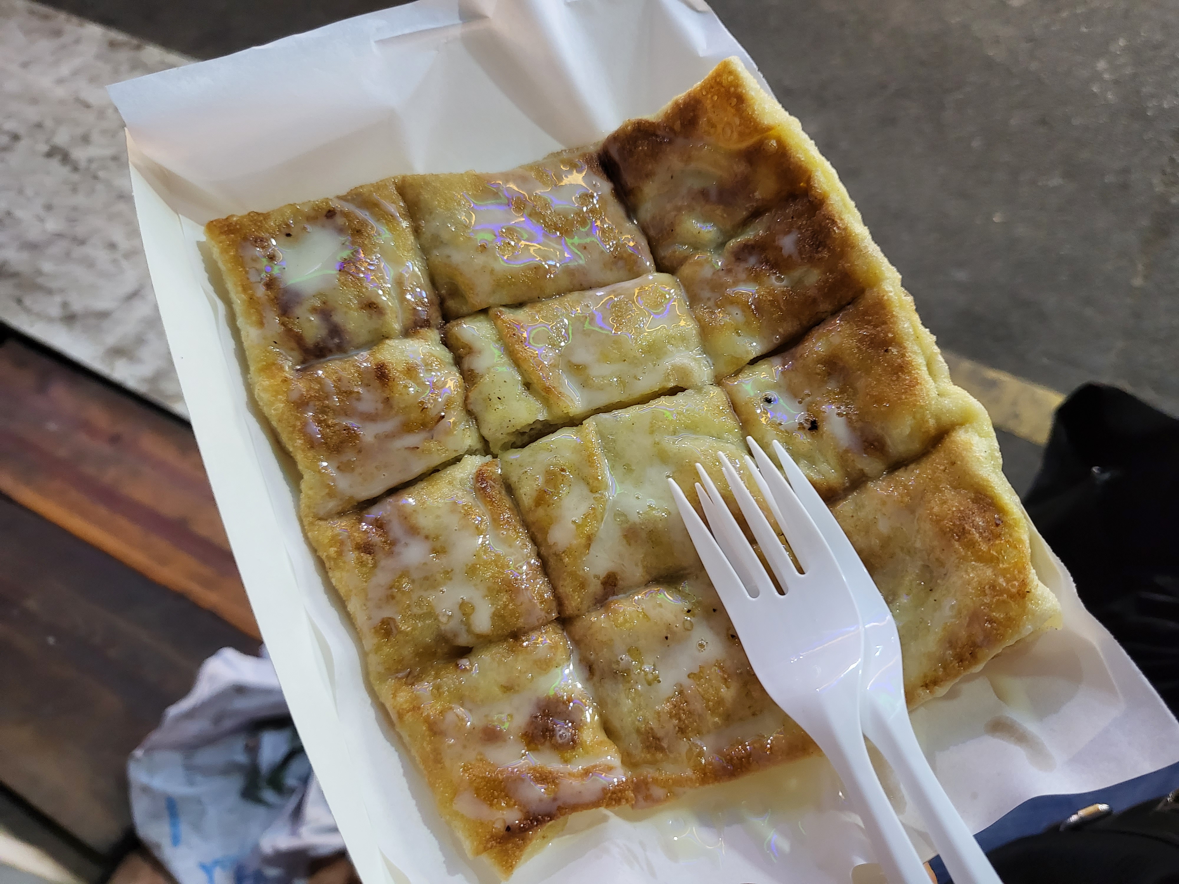 밀가루 반죽에 바나나와 계란을 섞어 구워서 그 위에 연유를 듬뿍 뿌려주는 간식입니다.